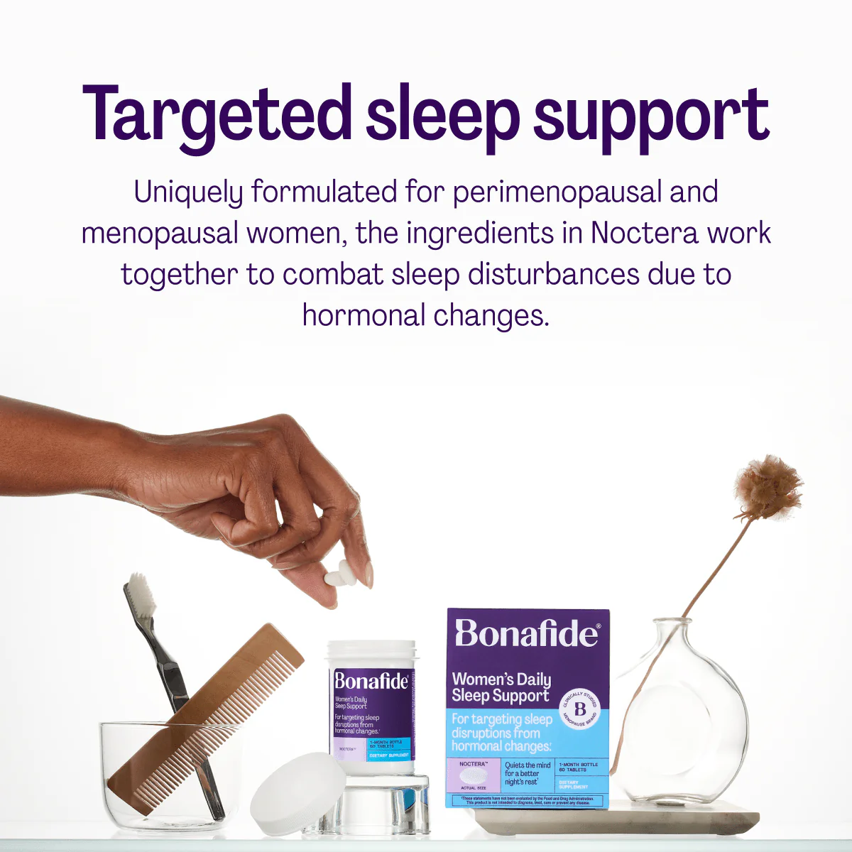 A daily supplement designed to combat sleep disruptions caused by hormonal changes, Noctera balances your body’s natural sleep signals to improve quality of sleep, reduce sleep disturbances, and increase daytime energy.*