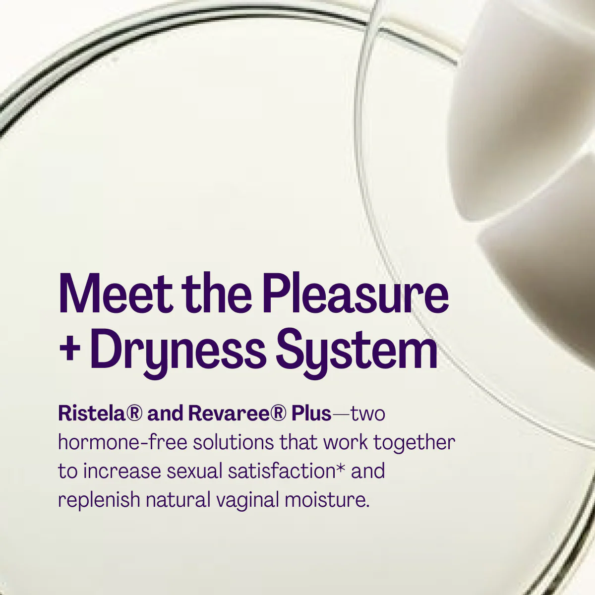 Meet the Pleasure + Dryness System, featuring Ristela® and Revaree® Plus—two hormone-free solutions that work together to increase sexual satisfaction* and replenish natural vaginal moisture.
