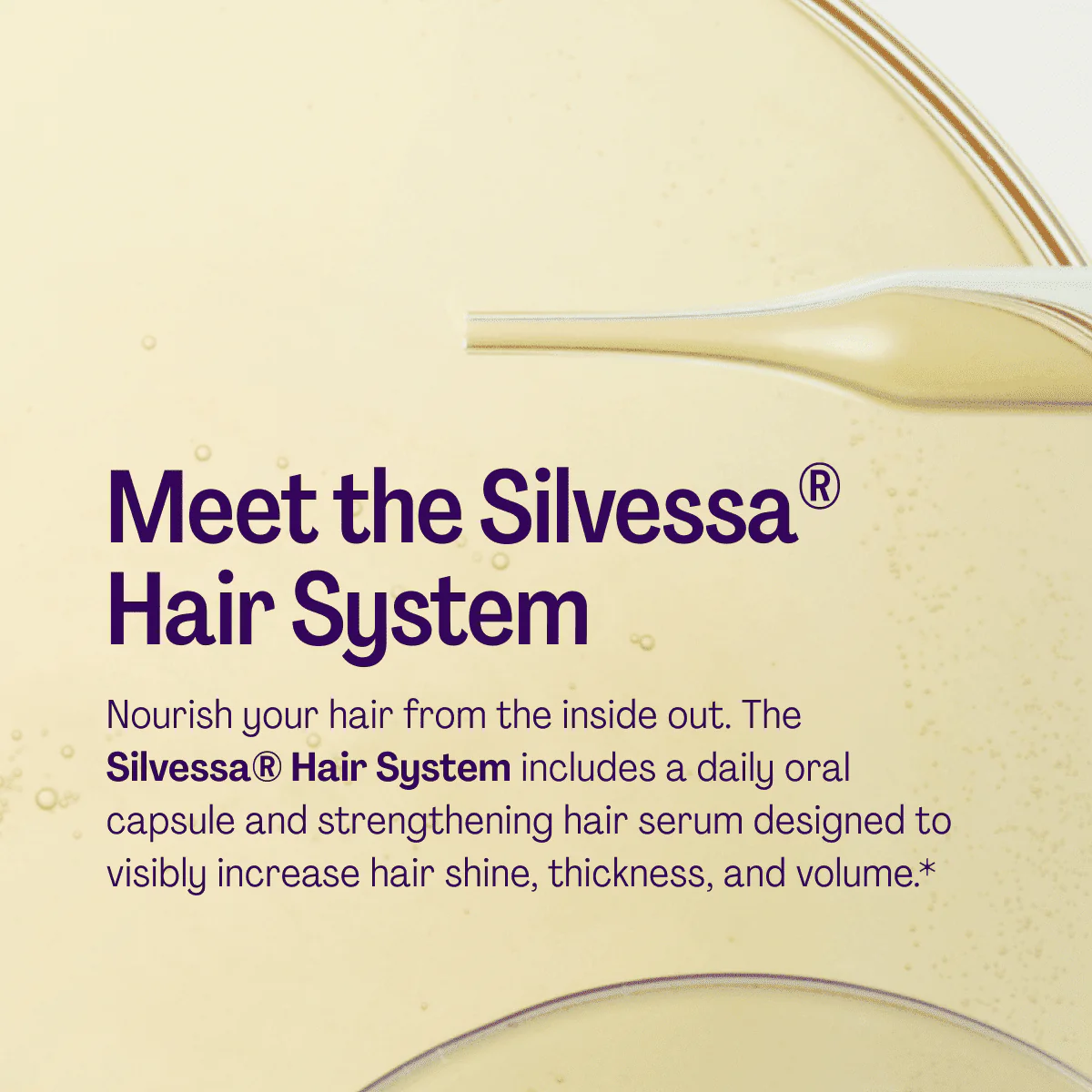 Nourish your hair from the inside out. The SilvessaĀ® Hair System includes a daily oral capsule and strengthening hair serum designed to visibly increase hair shine, thickness, and volume.*