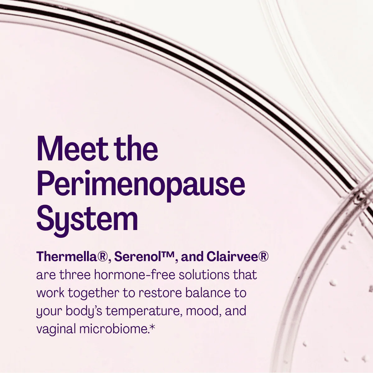 Meet the Perimenopause System, featuring Thermella®, Serenol™, and Clairvee®—three hormone-free solutions that work together to restore balance to your body’s temperature, mood, and vaginal microbiome.*